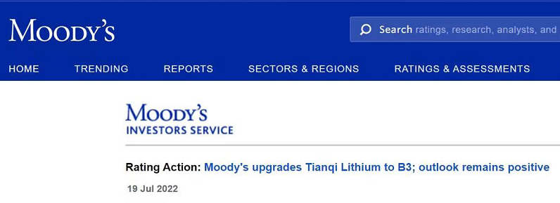 2022年7月19日,穆迪投资者服务公司宣布将天齐锂业股份有限公司 (以下简称“天齐锂业”) 的企业家族评级从“Caa1”上调至“B3”,并将由天齐芬可有限公司(天齐锂业海外全资子公司)发行、天齐锂业担保的高级无抵押债券评级从“Caa2”上调至“Caa1”,评级展望维持“正面”。
