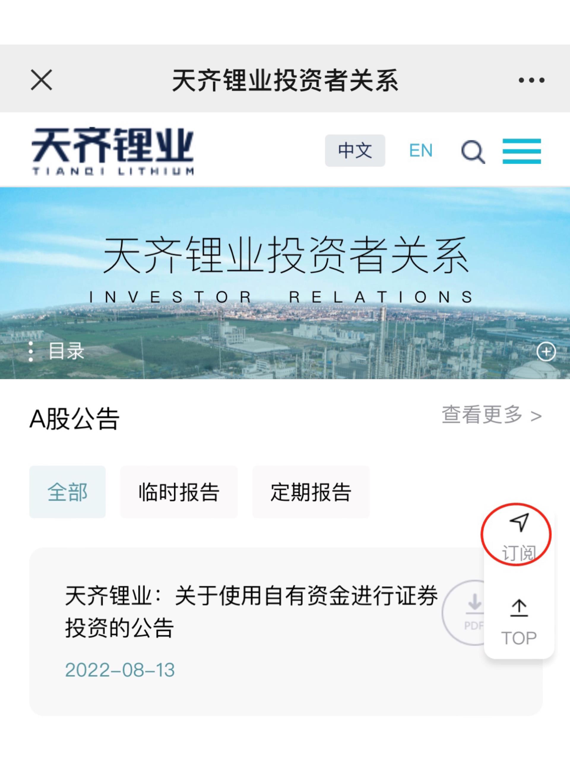 一、登录天齐锂业官网,选择“投资者关系”栏目,点击下图所示“订阅”按钮: