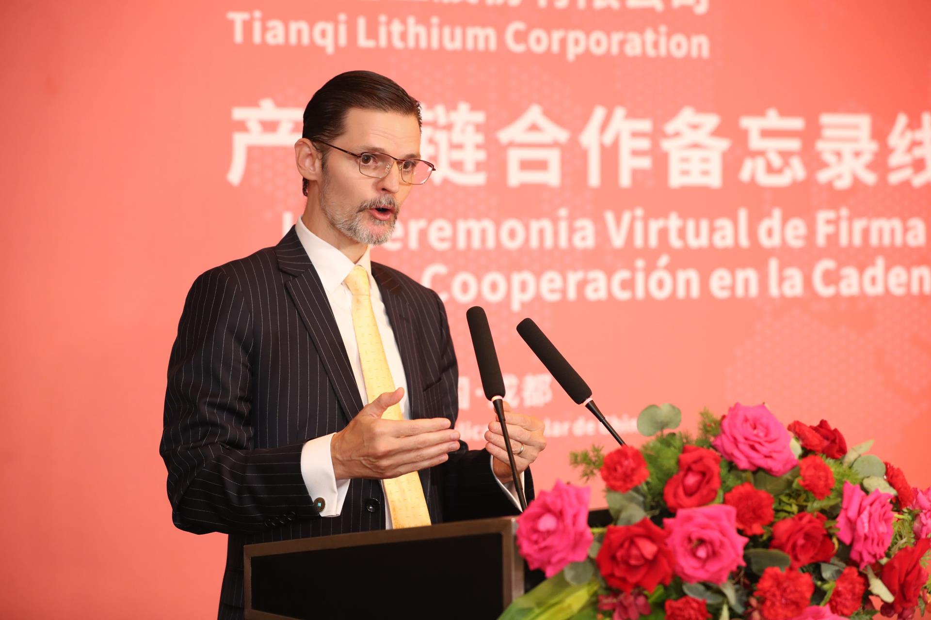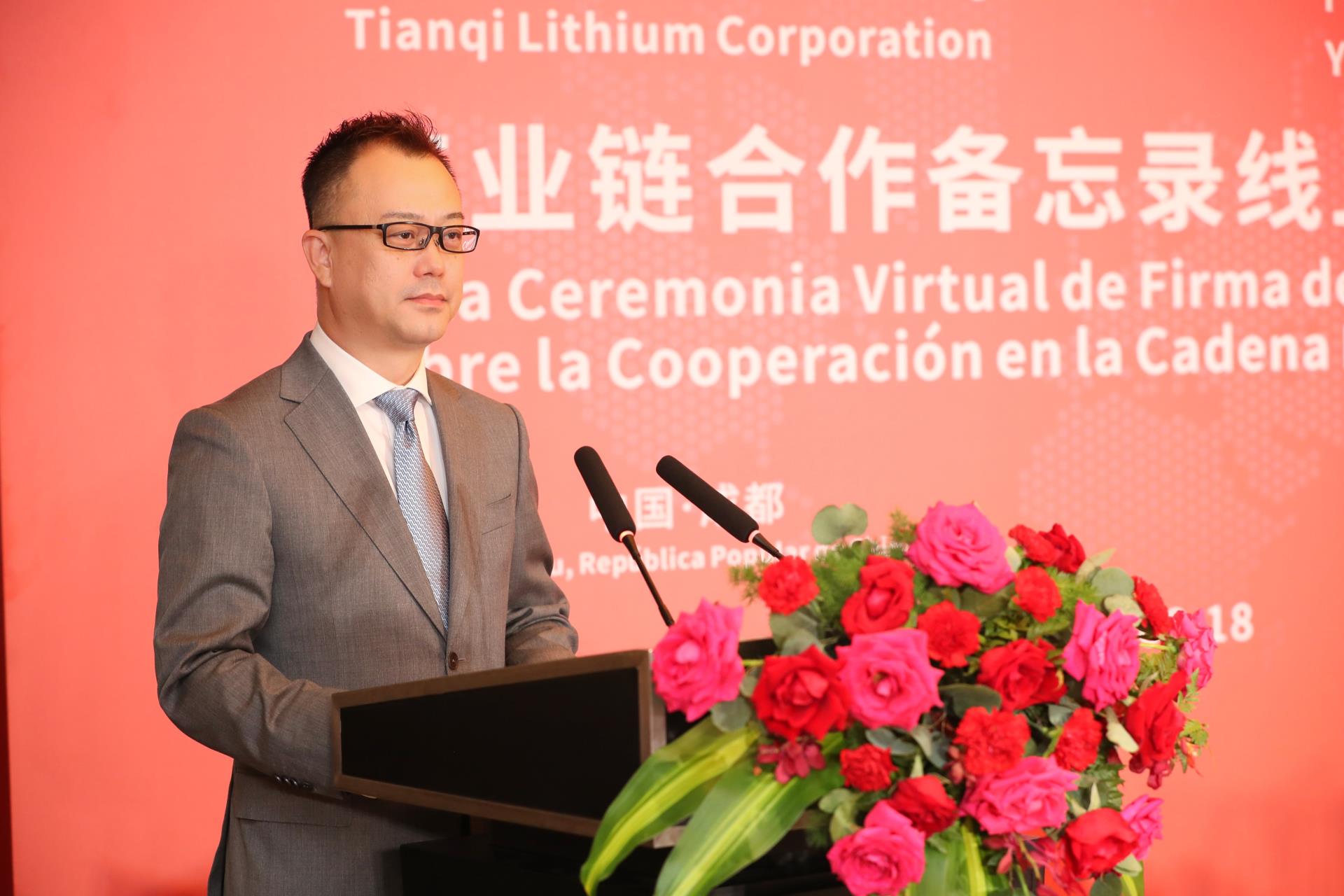 8月18日,天齐锂业与阿根廷YPF能源公司产业链合作备忘录线上签署仪式举行。天齐锂业副董事长蒋安琪女士、董事/总裁夏浚诚先生、阿根廷驻华大使牛望道先生、中国驻阿根廷大使馆公使衔参赞夏娣娅女士、四川省外事办副主任张业初先生等出席并见证签署仪式。YPF能源公司战略与商务拓展副总裁马科斯·萨贝利先生、YPF能源公司技术分公司总裁罗伯托·萨尔瓦雷萨先生和天齐锂业智利办公室负责人等在YPF能源公司会场参加签署仪式。