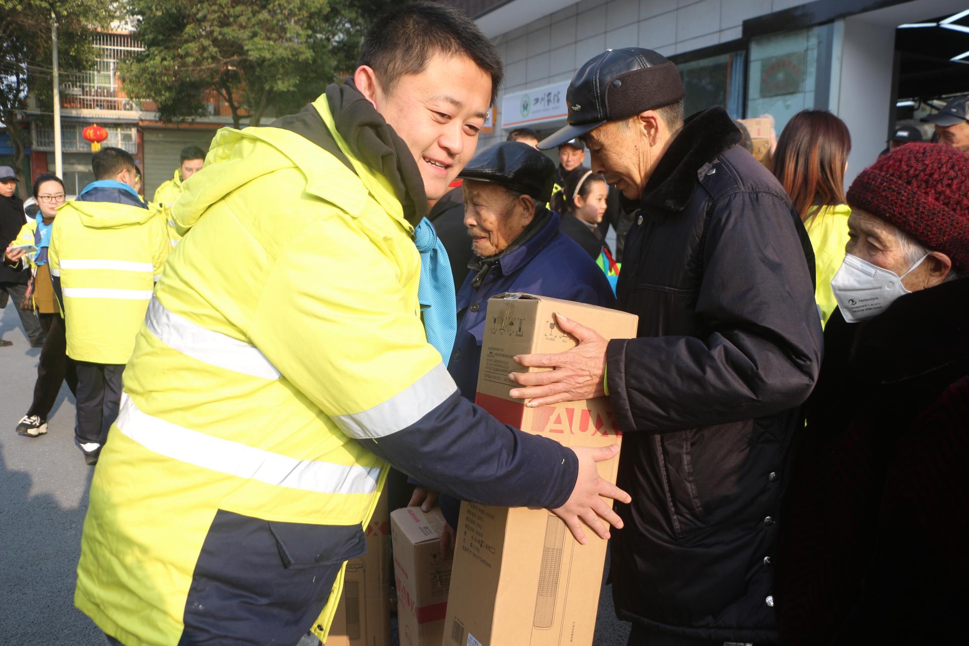 图 I 天齐志愿者向社区老人发放保暖物资