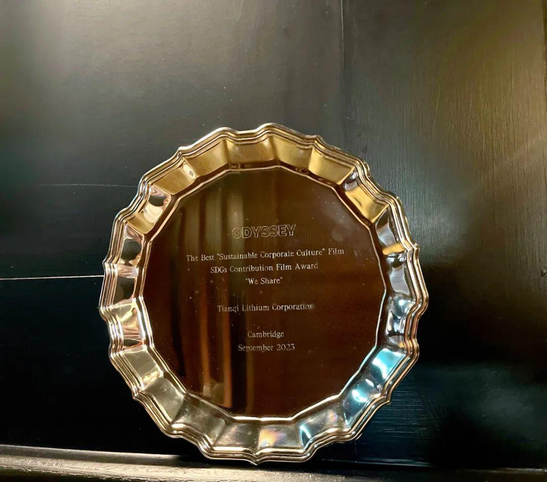 英国当地时间9月9日下午,由英中电影合作研发中心(UCFC)主办的 Odyssey电影节颁奖仪式在英国剑桥举行。Odyssey“可持续企业文化影片奖”是全球第一及唯一的,针对中资及华资企业,聚焦中国企业、注重可持续商业、关注企业文化的国际电影奖项。历时7个月,经过2轮筛选和专家评审,通过终审会议4小时的讨论和答辩,天齐锂业沙画We Share(我们分享)斩获佳绩。此次获奖是对天齐锂业在ESG(环境、社会、治理)可持续发展领域的持续努力和取得的突出成绩的充分肯定。