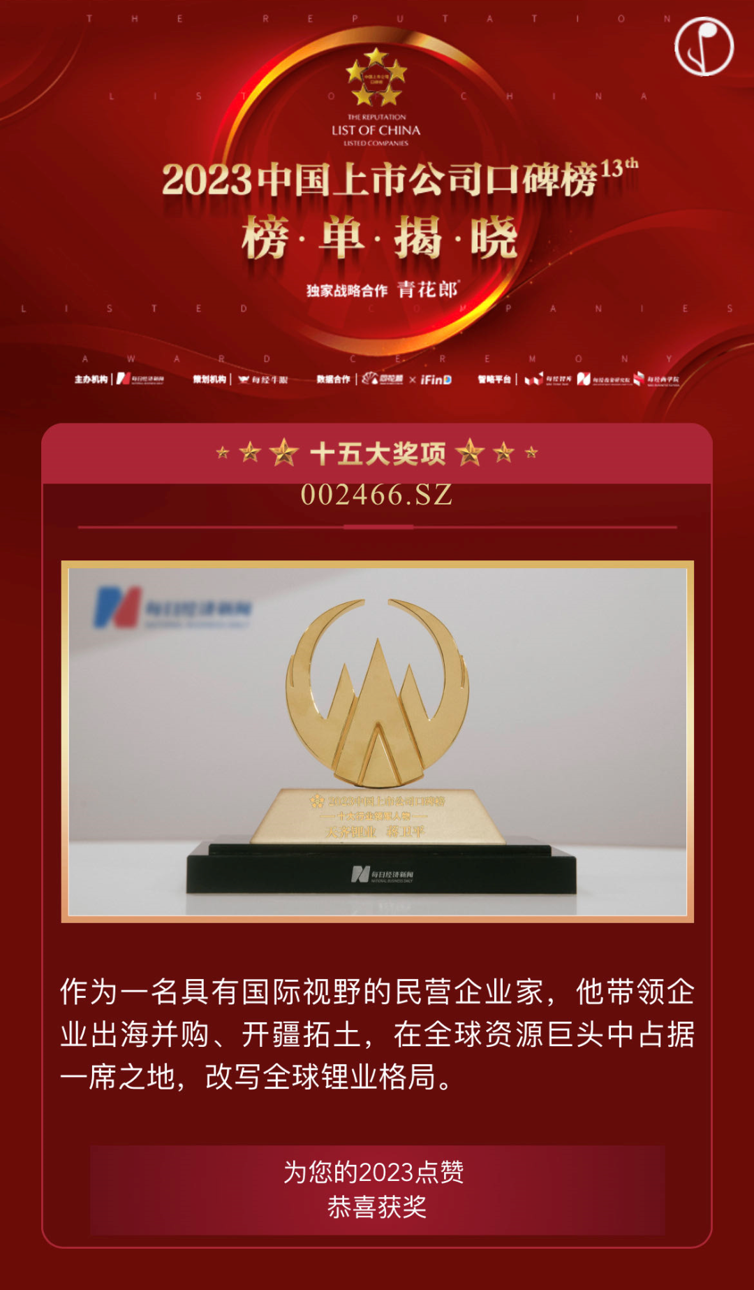 天齐锂业创始人、董事长蒋卫平先生带领公司全体董事会成员在公司治理、战略发展、管理合规等方面做出了杰出贡献,荣获“2023第十三届中国上市公司口碑榜”十大行业领军人物奖。