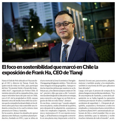 夏浚诚先生在演讲中介绍了天齐锂业的发展、海外布局、研发创新和ESG所取得的成果,分享了天齐锂业江苏张家港工厂的前生今世,并受到了智利主流媒体《智利三点钟报》特别报道,报道中这样写道:夏浚诚总裁在大约半个小时的时间里介绍了天齐锂业近年来为实现可持续采矿业所采取的措施。他讲述了天齐锂业收购张家港工厂的故事: