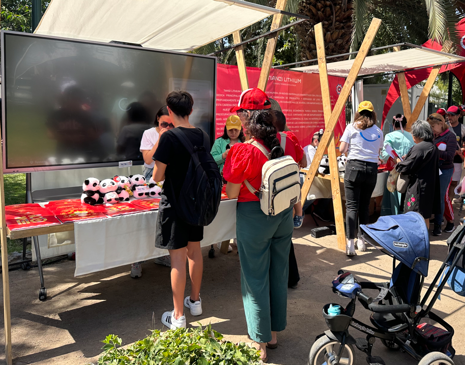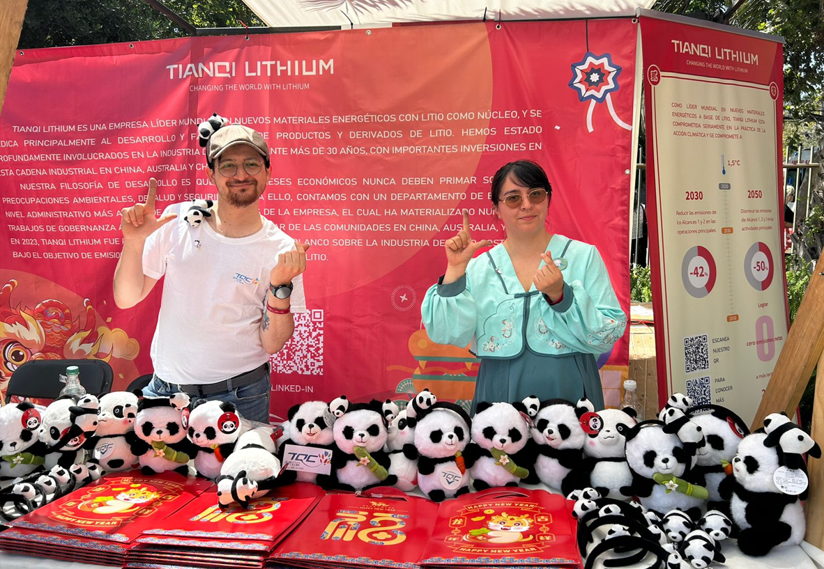 圣地亚哥雕塑公园的展位为智利民众提供中国书法、茶艺、剪纸、美食等文化体验。天齐锂业展位摆满了精心准备的礼物——熊猫玩偶,以及充满年味的福袋。