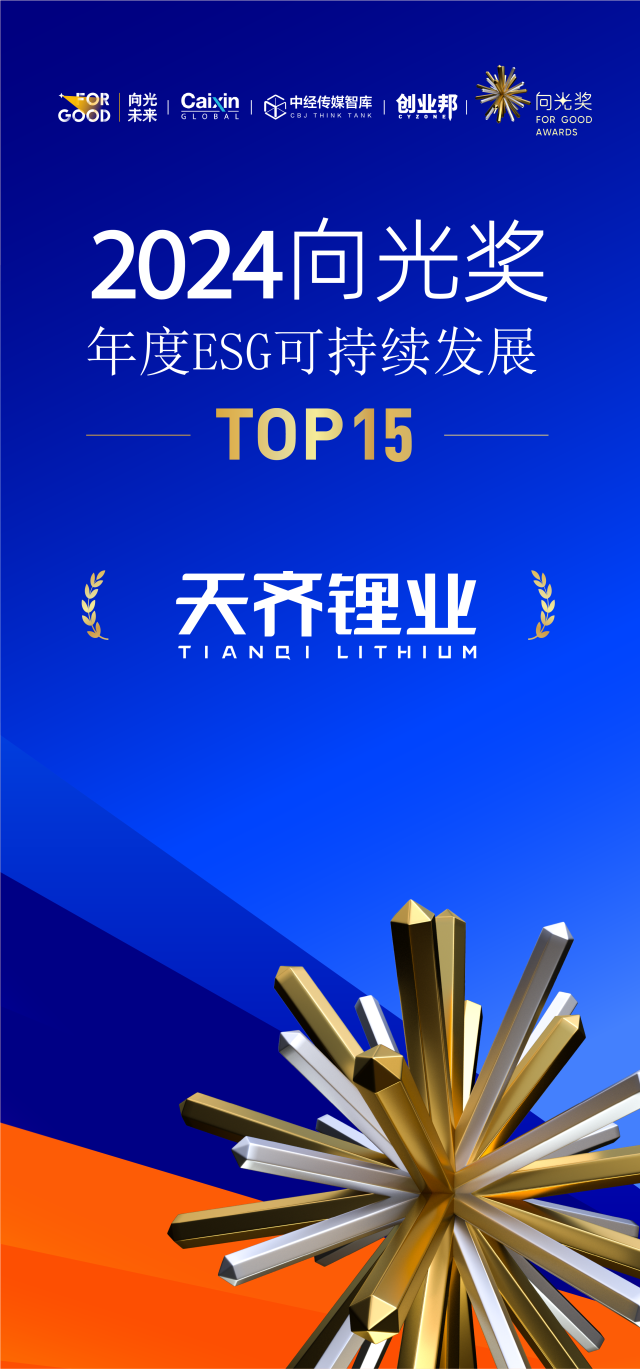 近日,在2024年ESG可持续商业生态大会上,天齐锂业凭借优秀的ESG治理实践斩获“2024向光奖 | 年度ESG可持续发展TOP15”。
