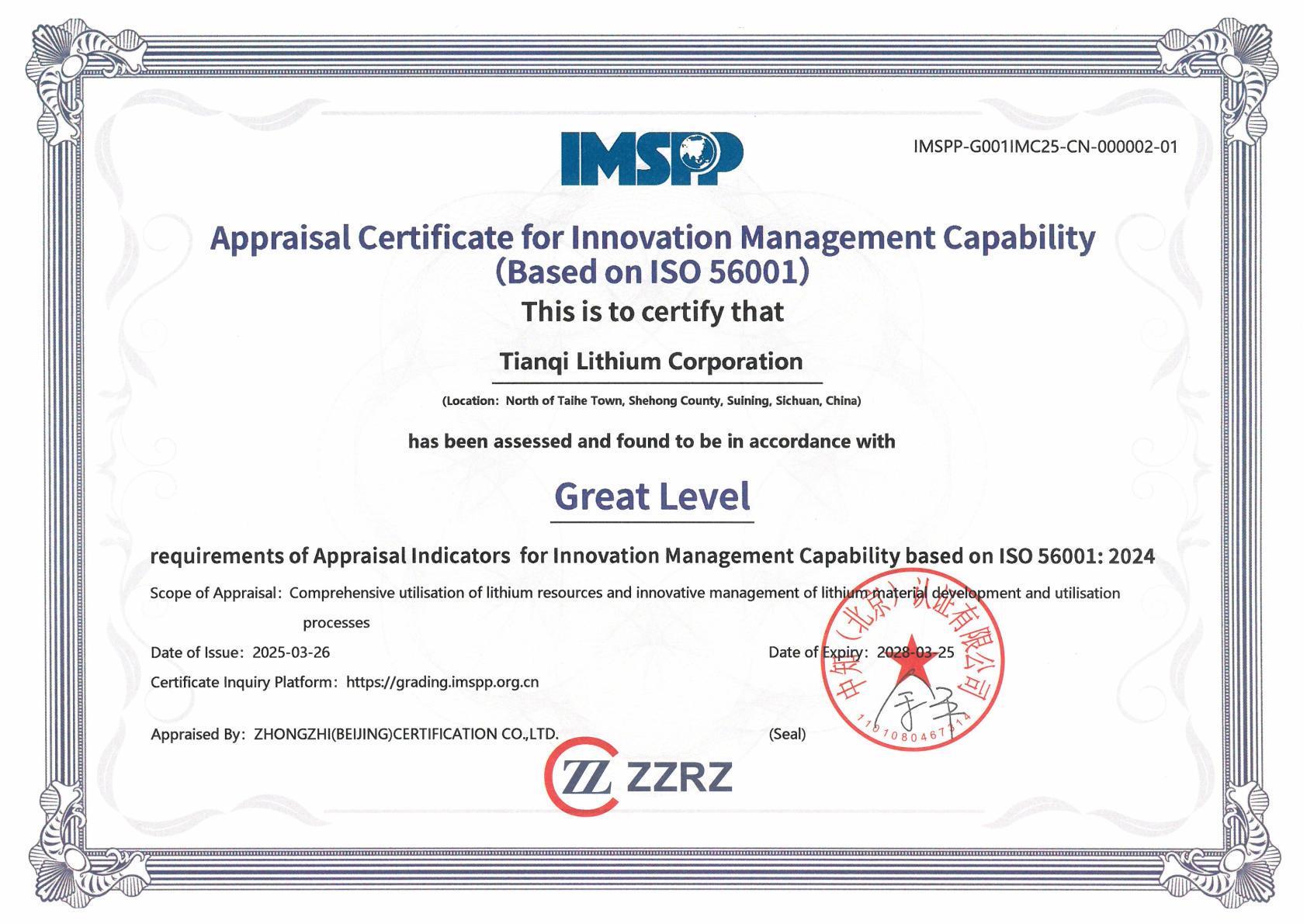 近日,天齐锂业股份有限公司(以下简称“天齐锂业”)凭借卓越的技术研发实力、战略引领的创新生态体系以及标准化的创新流程管理,荣获ISO 56001创新管理体系国际标准认证+评级(优秀级),成为锂行业中首家同时完成该体系认证与评级双项评定的企业。这一里程碑式成就,标志着天齐锂业在创新管理领域已跻身国际领先水平。