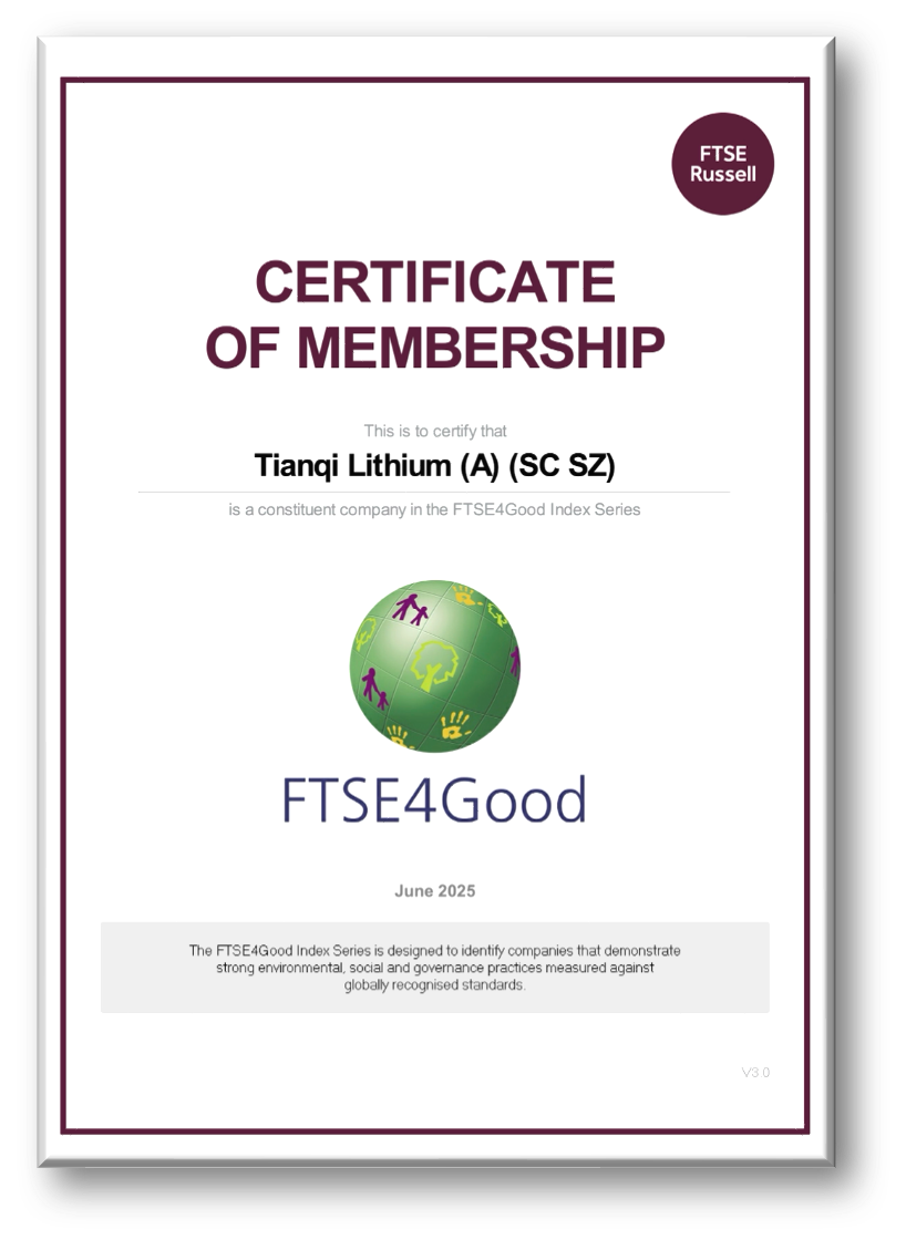 近日,天齐锂业凭借在可持续发展领域的卓越表现入选“富时社会责任指数系列”(FTSE4Good Index Series),公司已连续三年获得此项认可。