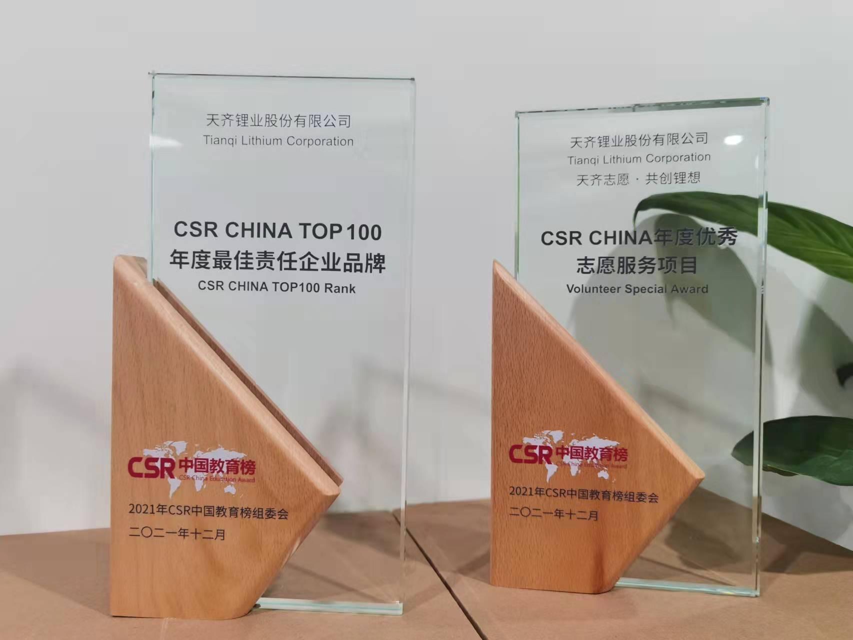 2021年12月6日,2021年企业社会责任教育项目优秀案例征集暨第五届CSR中国教育榜评比结果正式发布,天齐锂业和公司志愿服务项目分别荣获2021年CSR中国教育榜“CSR CHINA TOP 100年度最佳责任企业品牌”和“CSR CHINA年度优秀志愿服务项目”奖项。