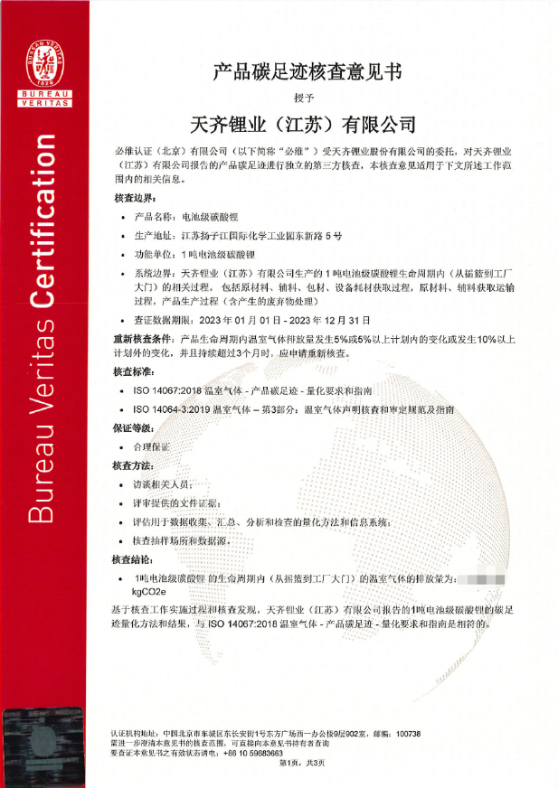 3) 天齐锂业每年根据环境管理生命周期评价原则及产品碳足迹量化指南,定期开展公司各基地三款主要产品(电池级碳酸锂、电池级氢氧化锂和金属锂)的环境足迹评价工作,并引入第三方鉴证机构对产品碳足迹的核算方法及原始数据进行鉴定,以回应各利益相关方。