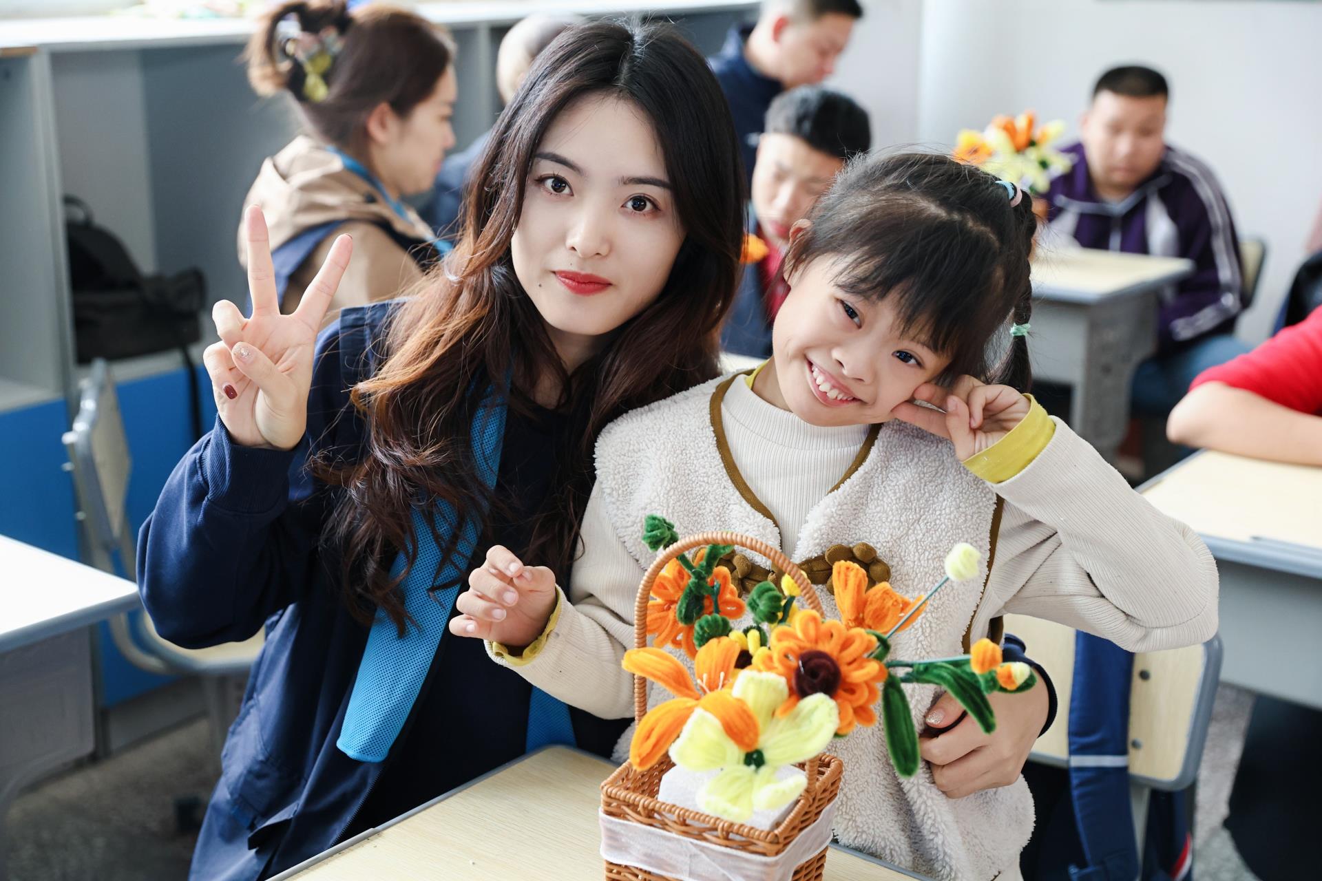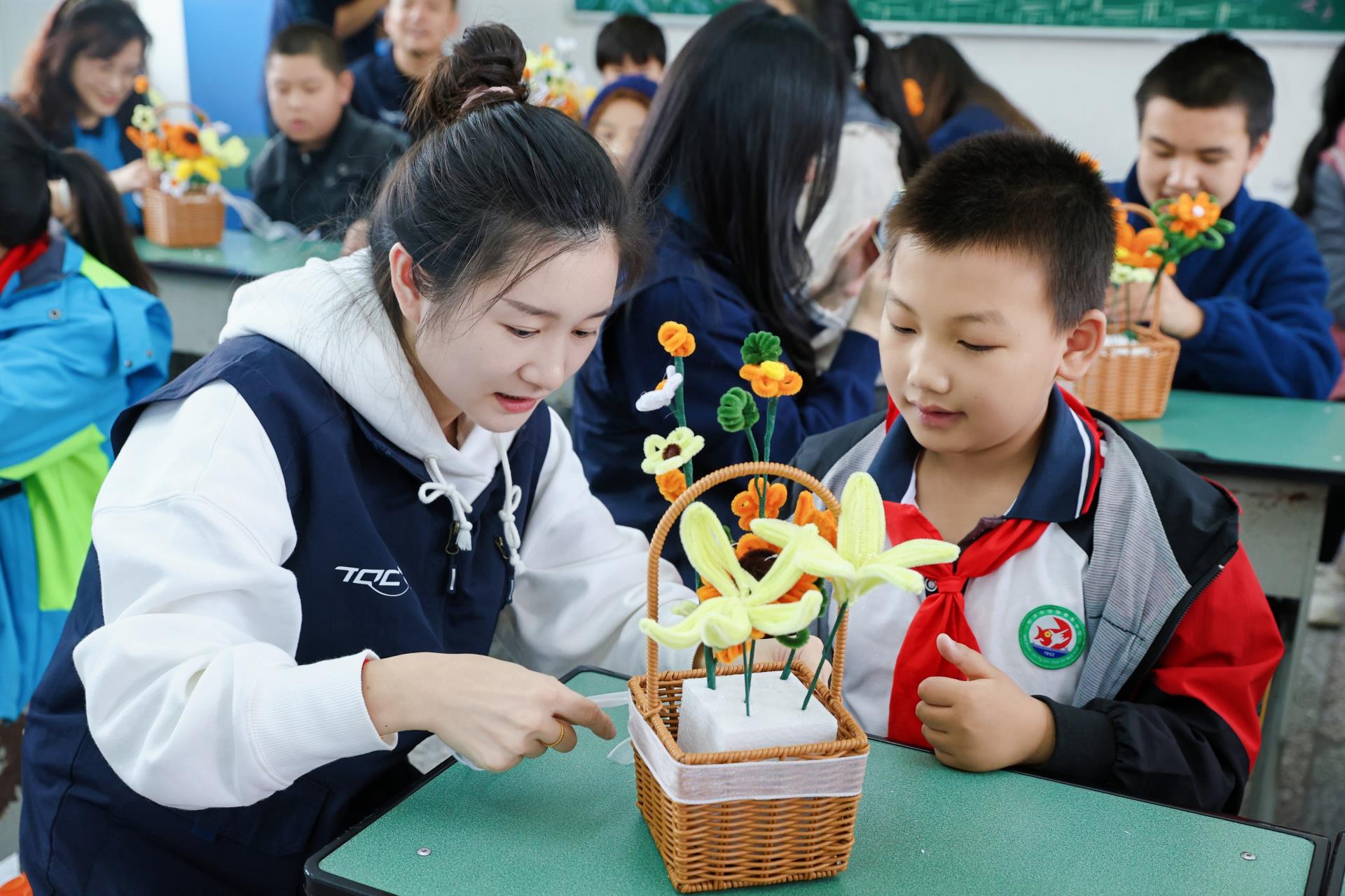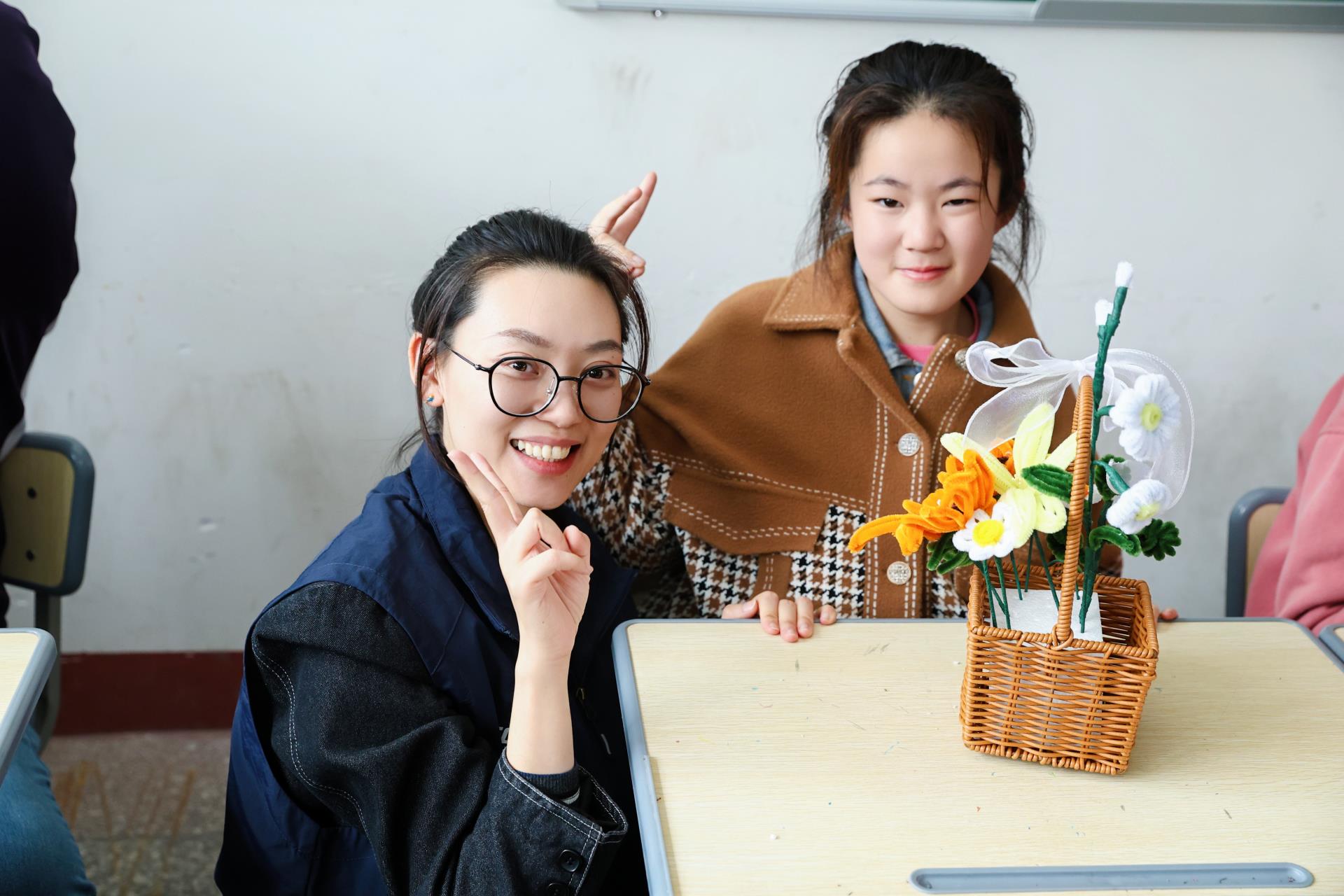 天齐的志愿者带领低年级小朋友们一起跳起了“手势舞”,小朋友们在轻松快乐的互动中,纷纷露出了纯真的笑容。还有志愿者和高年级的同学们一起DIY向日葵花篮,在大家的共同努力下,创作出一个又一个象征着生命、力量和希望的花篮。而这些充满童趣、承载祝愿的花篮将于本月飞跃重洋,出现在西澳洲的慈善拍卖会中。