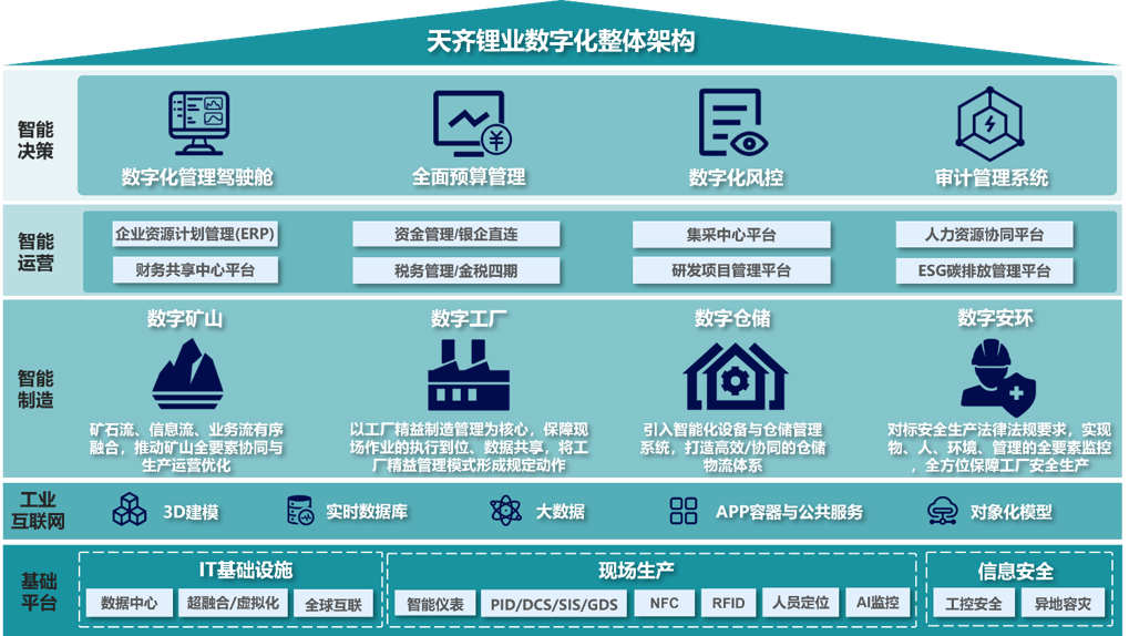 未来,天齐将不断通过数智赋能,打造一个横向协同、纵向管控、灵活适应、全面支撑的生产运营体系,在全球复杂多变市场环境下实现企业的提质增效、成本优化,为公司的可持续发展注入强大动力,为行业向低碳、绿色、智能、高端迈进做好示范引领。