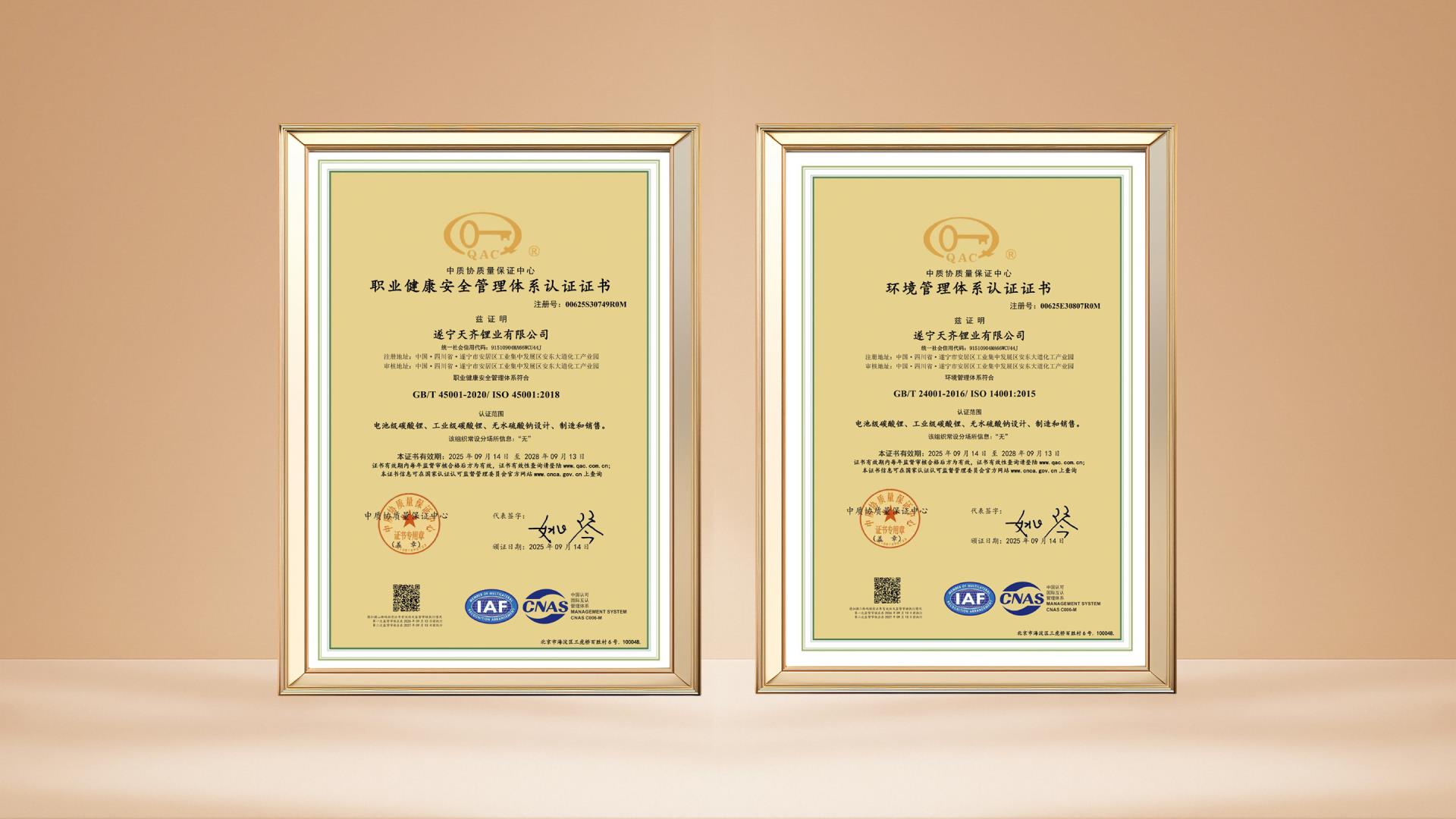 筑牢绿色安全与卓越品质基石——天齐锂业安居基地揽获三项管理体系认证