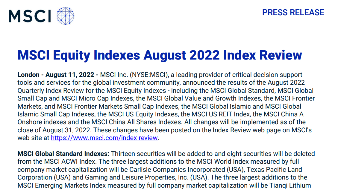 北京时间8月12日早间,全球知名指数公司MSCI宣布了季度审核变更结果,将天齐锂业等7只A股股票新纳入MSCI中国指数。