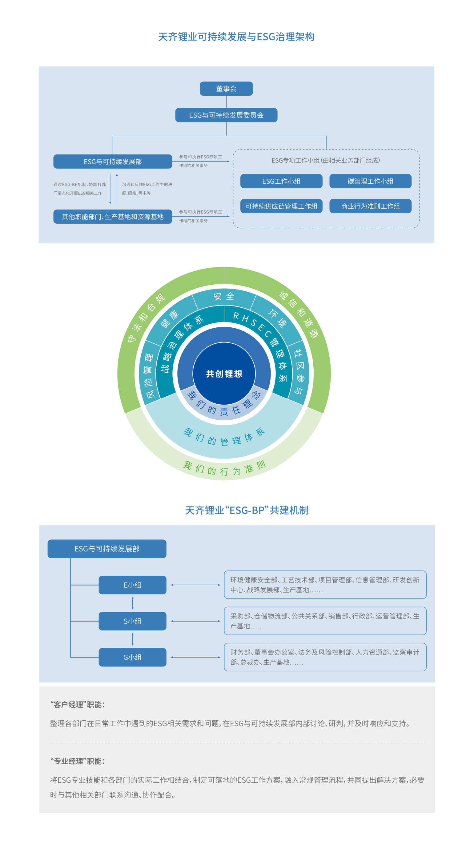 治理:天齐锂业建立了权责完善、分工清晰的ESG治理架构。董事会是公司ESG治理的最高责任机构,并由ESG与可持续发展委员会负责制定ESG与可持续发展愿景、目标及策略;ESG与可持续发展委员会每年至少举行一次会议,就ESG相关议题与董事沟通;专职ESG与可持续发展部负责执行落地。部门现已建立 “ESG-BP”(ESG共建伙伴)机制,担负起为各职能部门、海内外生产基地落实ESG工作提供支持和服务重任,在生产运营和管理中推进可持续发展理念。